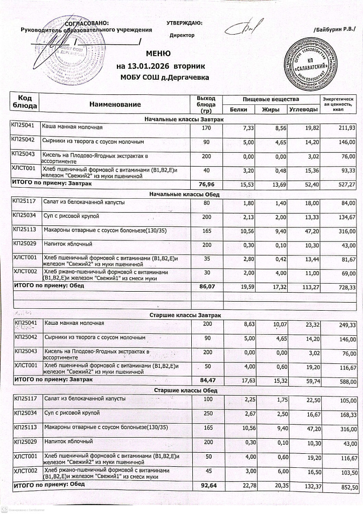 Меню и контрольные блюда на 13.01.2026 года