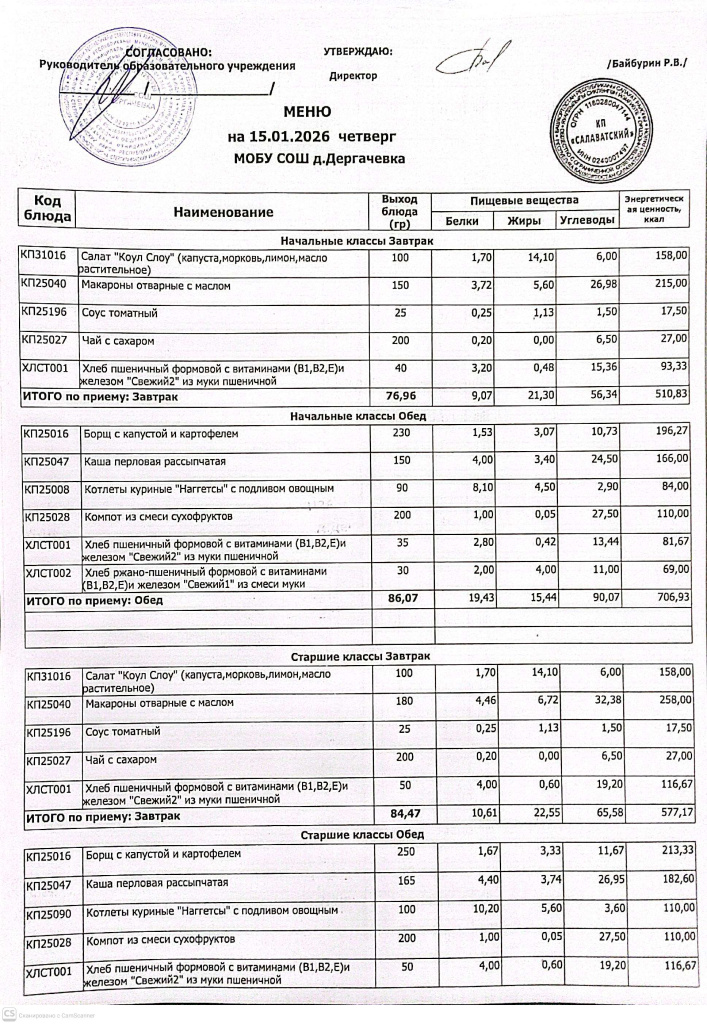 Меню и контрольные блюда на 15.01.2026 года