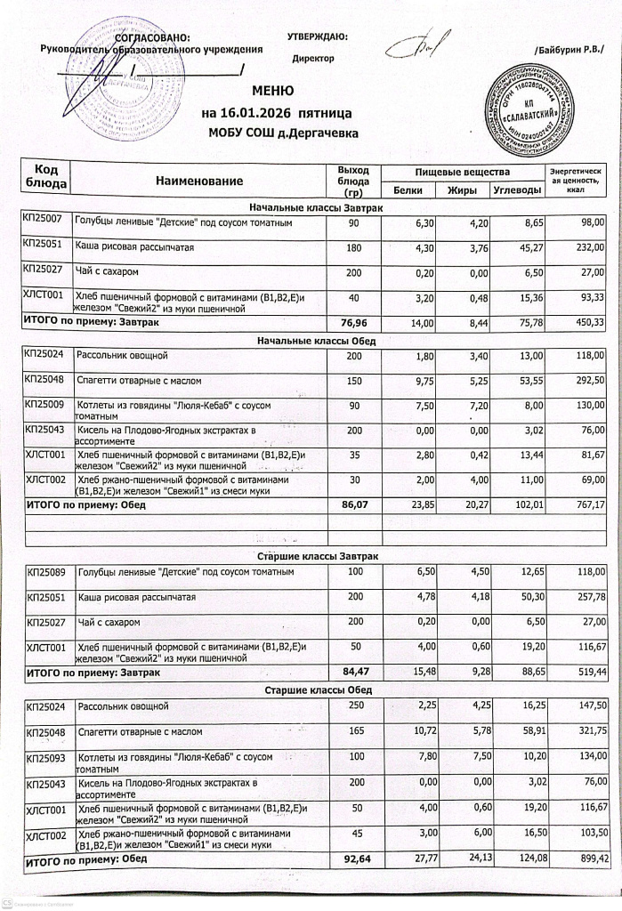 Меню и контрольные блюда на 16.04.2025 года
