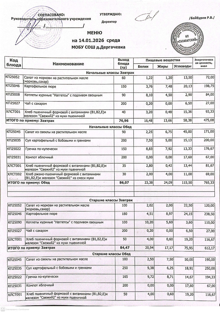 Меню и контрольные блюда на 14.01.2026 года