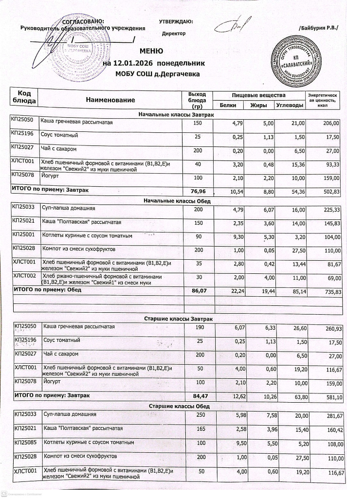 Меню и контрольные блюда на 12.01.2026 года